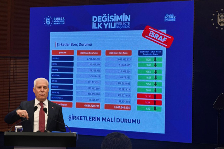 Bursa Büyükşehir Belediye Başkanı Mustafa Bozbey, ‘Değişimin İlk Yılı: Birlikte Başardık’ adlı 1 yılda yapılan çalışmalarını anlattığı basın toplantısında Tarım A.Ş.'nin 2024'ün nisan ayında 418 milyon 456 bin 400 TL olan borcununbu yılın nisan ayında yüzde 131 artışla 968 milyon 127 bin 667 TL'ye çıktığını kaydetmişti.