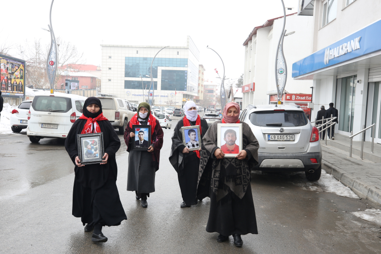 Çocuklarına kavuşma ümidiyle her hafta çarşamba günü DEM Parti İl Başkanlığı binası önünde yaptıkları eylemlerini sürdüren aileler, "Anneler direniyor", "Evlat nöbetindeyiz" ve "Artık yeter yakamızdan düşün" yazılı pankartlar açtı.