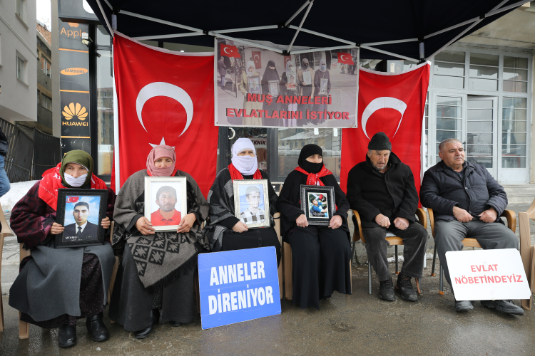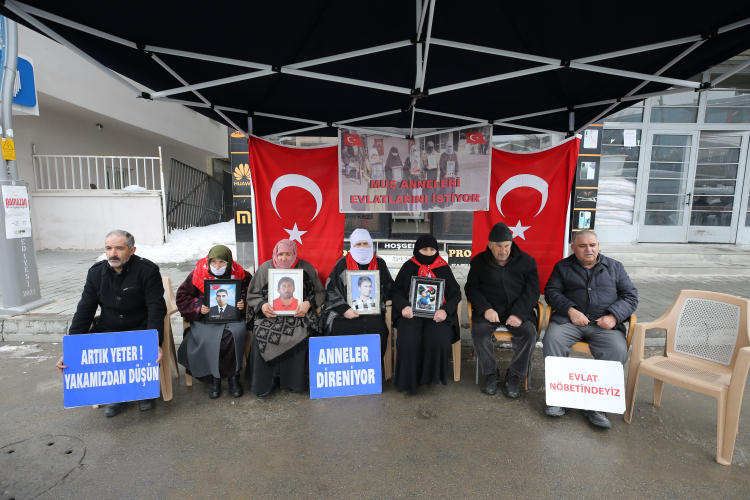Muş'ta çocukları terör örgütü PKK tarafından kaçırılan aileler, DEM Parti İl Başkanlığı binası önündeki eylemlerinde çocuklarına teslim olmaları çağrısında bulundu.