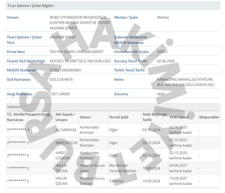 Daha önce geçici mühlet kapsamında atanan konkordato komiserleri Ali Karakaş, Hafiz Coşkun ve Barış Küçük’ün de görevleri devam edecek.