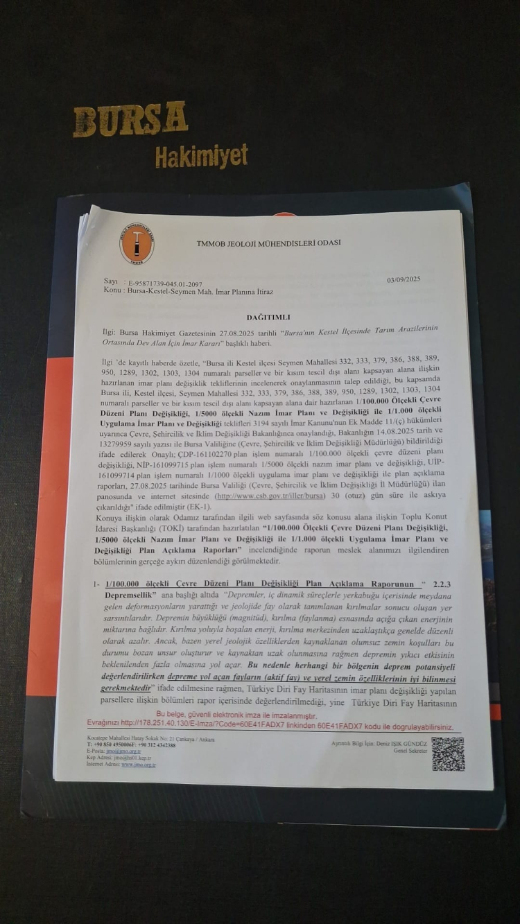 bursahakimiyet.com.tr'nin, "Bursa'da tarım arazilerinin ortasındaki dev alan için imar kararı!" ve "TOKİ'den Bursa'ya 712 konut daha! Planlar askıya çıktı, gözler ihalede..." başlıkları haberleri sonrası TMMOB Jeoloji Mühendisleri Odası'ndan dikkat çeken bir hamle geldi.