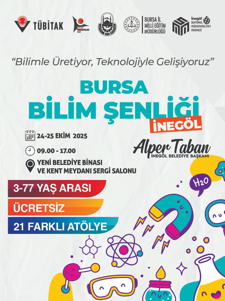 Bursa İl Milli Eğitim Müdürlüğü iş birliği ile TÜBİTAK 4007 Bilim Şenlikleri Destekleme Programı kapsamında düzenlenen “Bursa Bilim Şenliği: Bilimle Üretiyor, Teknolojiyle Gelişiyoruz” etkinliği, İnegöl Belediyesi ev sahipliğinde 2 gün boyunca içe halkıyla buluşacak. 24 Ekim Cuma ve 25 Ekim Cumartesi günleri yapılacak Bilim Şenliği, 3 yaştan başlamak üzere 77 yaşa kadar herkese hitap eden atölyelerle İnegöllüleri bilimle buluşturacak.