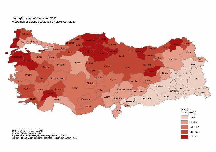 Buna göre, yaşlı nüfus olarak kabul edilen 65 ve daha yukarı yaştaki nüfus, 2018 yılında 7 milyon 186 bin 204 kişi iken son beş yılda yüzde 21,4 artarak 2023 yılında 8 milyon 722 bin 806 kişi oldu. Yaşlı nüfusun toplam nüfus içindeki oranı ise 2018 yılında yüzde 8,8 iken, 2023 yılında yüzde 10,2'ye yükseldi. Yaşlı nüfusun 2023 yılında yüzde 44,5'ini erkek nüfus, yüzde 55,5'ini kadın nüfus oluşturdu.