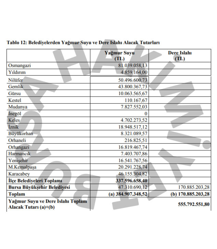 Yağmur suyu işleri hakkındaki 384 milyon 907 bin 348 TL 52 kuruşluk borcun 337 milyon 596 bin 585 TL 40 kuruşu ilçe belediyelerine, 47 milyon 310 bin 690 TL 12 kuruşu ise Bursa Büyükşehir Belediyesine ait.