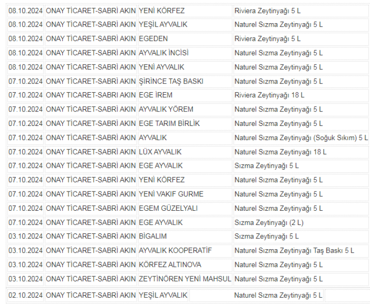 Onay Ticaret - Sabri Akın adlı firmanın piyasaya sürdüğü Yeni Körfez, Yeşil Ayvalık, Egeden, Ayvalık İncisi, Yeni Ayvalık, Şirince Taş Bakı, Ege İrem, Ayvalık Yörem, Ege Tarım Birlik, Ayvalık, Lüx Ayvalık, Ege Ayvalık, Yeni Körfez, Yeni Vakıf Gurme, Egem Güzemyalı, Bigalım, Ayvalık Kooperatif, Körfez Altınova ve Zeytinören Yeni Mahsul markalı zeytinyağlarından alınan 21 numunede tohum yağları tespit edildi.