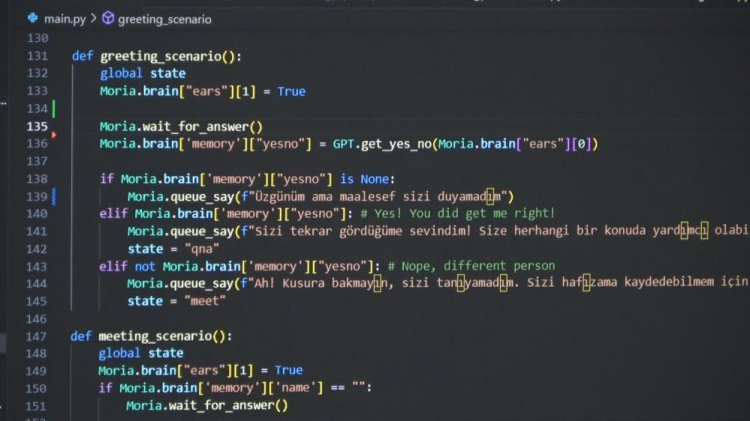 Moria'da birçok farklı mod olduğunu kaydeden Adar, etkileşime göre tepki verdiğini söyleyerek, "Robotumuz 'serbest mod' dediğimiz bir modda çalışıyor. Bu moddayken etrafını inceliyor ve bir insan olup olmadığını kontrol ediyor. Eğer bir insanla karşılaşıyorsa 'sosyal mod' açılıyor ve karşısındaki kişiye 'merhaba ben Moria' diye kendini tanıtıp karşı taraftan cevap bekliyor. Karşı taraftan aldığı cevaba göre karşı tarafı tanıyıp tanımadığını kontrol ediyor. Daha önceden tanıdığı bir kişi ise ismi ile hitap ediyor. Eğer tanımadığı bir kişi ise bu durumda 'tanışma modu' açılıyor. Bu modda kişinin ismini soruyor, bir adet fotoğraf çekip hafızaya kaydediyor. Bir sonraki soruya cevaplar üretiyor. Burada yapay zeka, görüntü işleme ve farklı algoritmalardan destek almış bulunmaktayız. Şu anki geliştirdiğimiz platformda robotumuz karşı tarafın sorusunu dinleyip sonra cevap oluşturuyor. Kendisi konuşurken siz devreye girerseniz konuştuğunuzu dinlemiyor. Bunun üzerine çalışmalarımızı sürdürüyoruz" dedi.