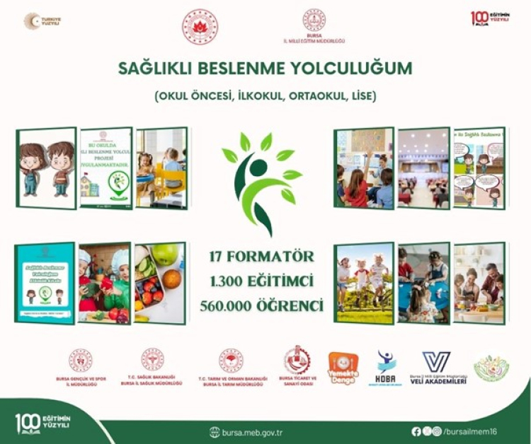 Türkiye'nin en kapsamlı sağlıklı beslenme ve hareketli yaşam projelerinden biri olan "Sağlıklı Beslenme Yolculuğum", Bursa Valiliği himayesinde, Bursa İl Millî Eğitim Müdürlüğü'nün koordinatörlüğünde ve geniş bir paydaş katılımıyla hayata geçiriliyor. 17 ilçede uygulanacak olan proje, 17 formatör, 1300 eğitimci ve 560.000 öğrenciyi kapsayarak geleceğin nesillerini bilinçli, sağlıklı ve aktif bireyler olarak yetiştirmeyi amaçlıyor.