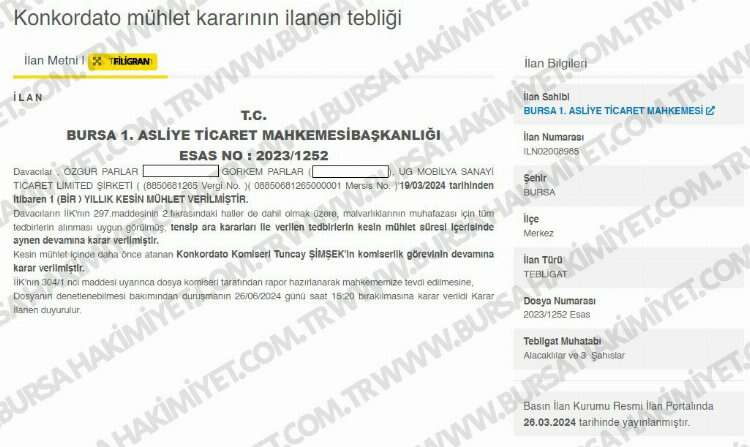Davacılar, Özgür Parlar, Görkem Parlar, UG Mobilya Sanayi Ticaret Limited Şirketi (8850681265 Vergi No. ) ( 08850681265000001 Mersis No. ) 19/03/2024 tarihinden itibaren 1 (bir ) yıllık kesin mühlet verilmiştir.