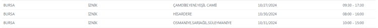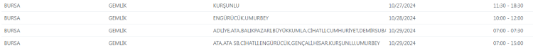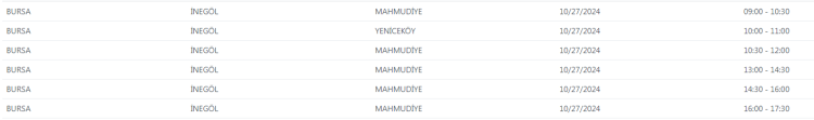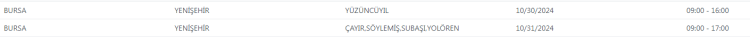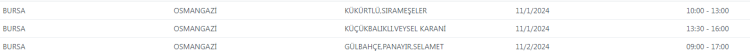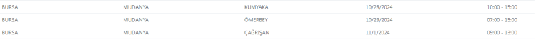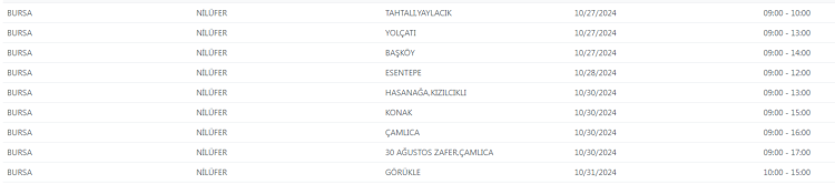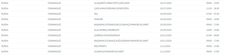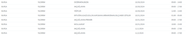 UEDAŞ tarafından yapılan duyuruda, "Şebeke çalışması sebebiyle Bursa'da belirtilen adreslerde enerji kesintisi uygulanacaktır. Yapılacak olan çalışmanın erken bitmesi halinde planlanan bitiş saatinden önce enerji verilecektir." ifadelerine yer verildi.