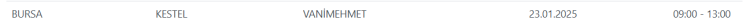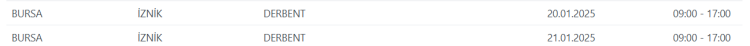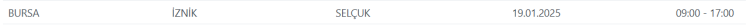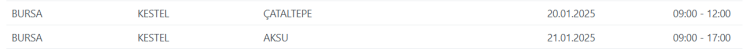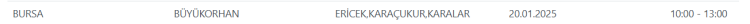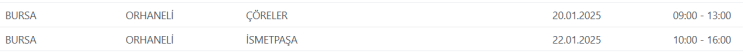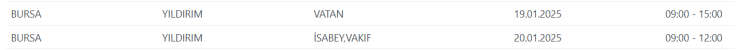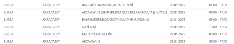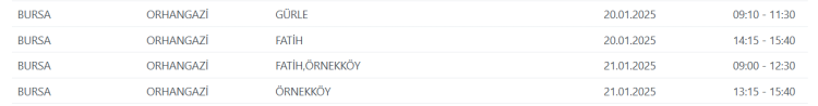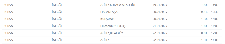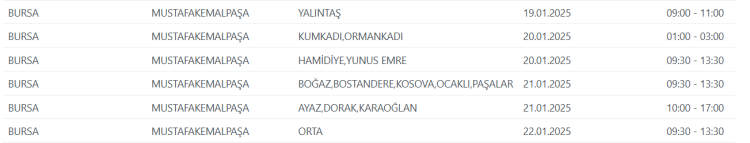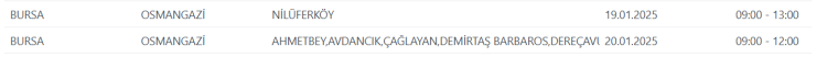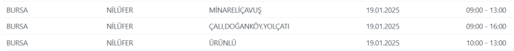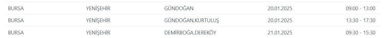 Yapılacak olan kesintiler Bursa'nın Büyükorhan, Gürsu, Gemlik, İnegöl, Karacabey, İznik, Kestel, Nilüfer, Mustafakemalpaşa, Orhaneli, Orhangazi, Osmangazi, Yenişehir ve Yıldırım ilçelerindeki bazı mahallelerde meydana gelecek.