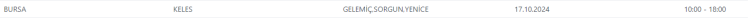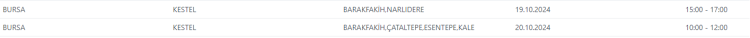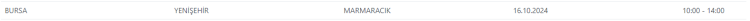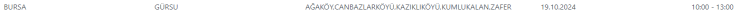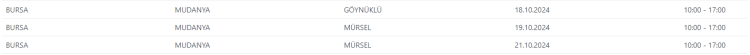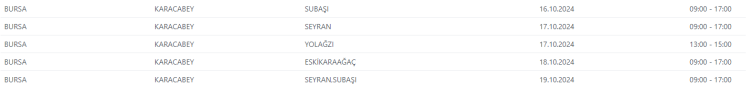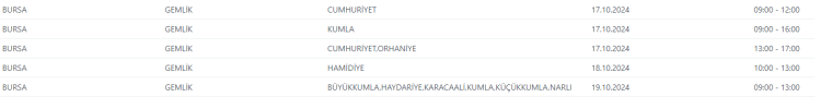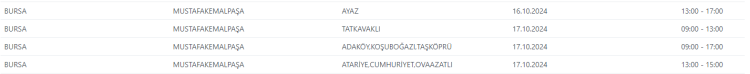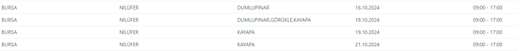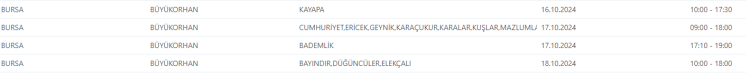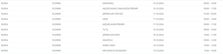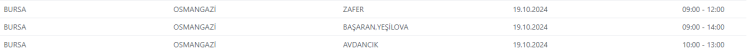 Kesintiler Bursa'nın Büyükorhan, Gemlik, Gürsu, İnegöl, İznik, Karacabey, Keles, Kestel, Mudanya, Mustafakemalpaşa, Nilüfer, Orhangazi, Osmangazi, Yenişehir ve Yıldırım ilçelerindeki bazı noktalarında meydana gelecek.