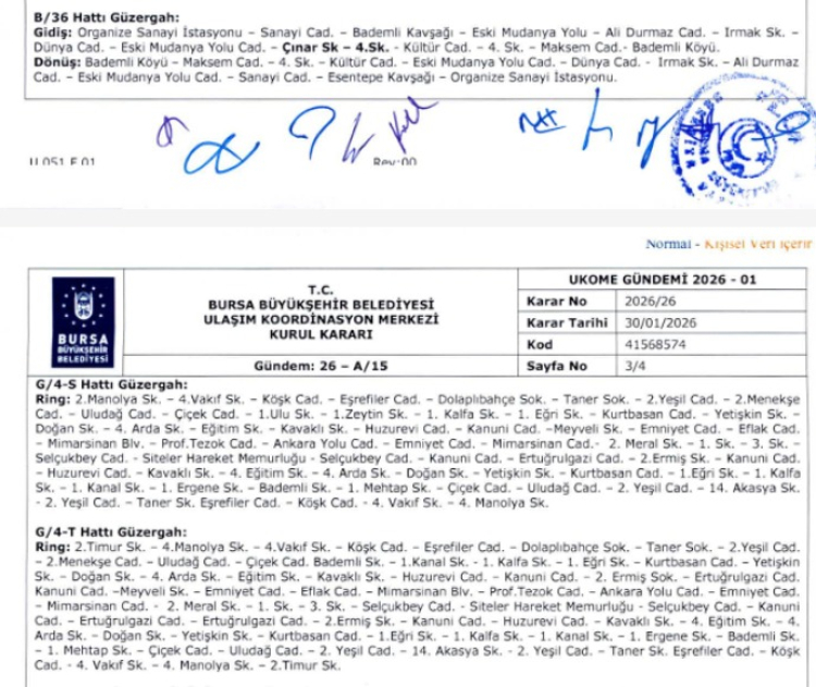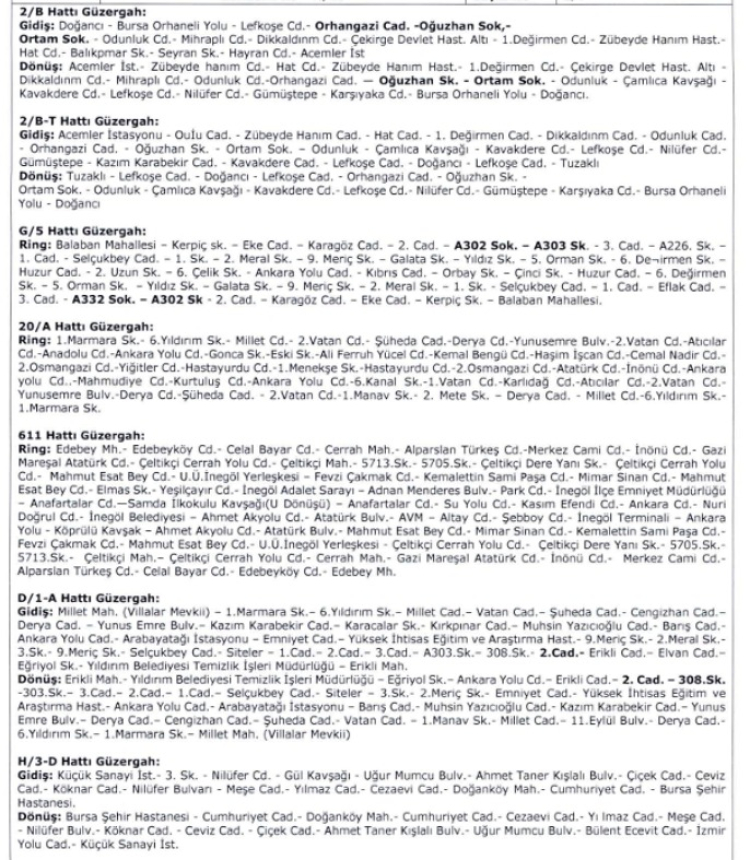 Bursa Büyükşehir Belediyesi Ulaşım Koordinasyon Merkezi (UKOME), çok sayıda otobüs hattının güzergahının değiştirilmesi için karar aldı. İşte B/34, B/34-U, B/36, G/4-S, G/4-T, H/3-D, D/1-A, 611, 20/A, G/5, B/20-C, 2/B-T ve 2/B hatlarının yeni güzergahları...