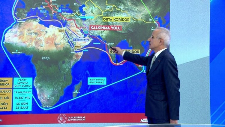Dünyada kuzey, orta ve güney koridor var. Güney koridorda Kızıldeniz ve Süveyş Kanalı'ndan geçişlerde sıkıntıların olduğunu biliyoruz. 10 milyar dolarlık bir zarar olmuştu. Bizim kalkınma yolu bu güney koridorunun önemli bir parçası ve orta koridorla da entegre. Denizden gelen yükler Faw limanında karaya çıkarak Irak topraklarından 1200 km'lik yapılacak olan demiryolu ve karayoluyla beraber bizim Habur Sınır Kapısı'nın batısındaki Ovaköy'den ülkemize giriş yapacak. Şanlıurfa, Gaziantep, Adana, Karaman, Eskişehir, İstanbul ve Kapıkule. Demiryolu hattı böyle. Ülkemize geldiğinde de bütün 3 denize de demiryolu ve karayoluyla bağlanmış olacak.