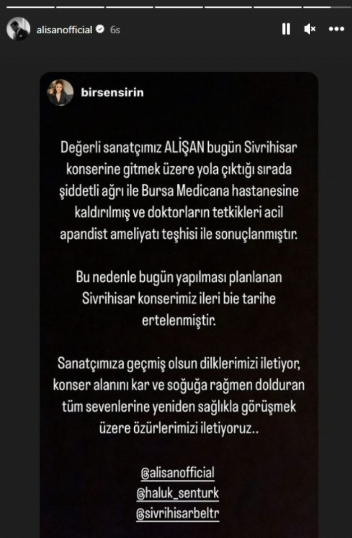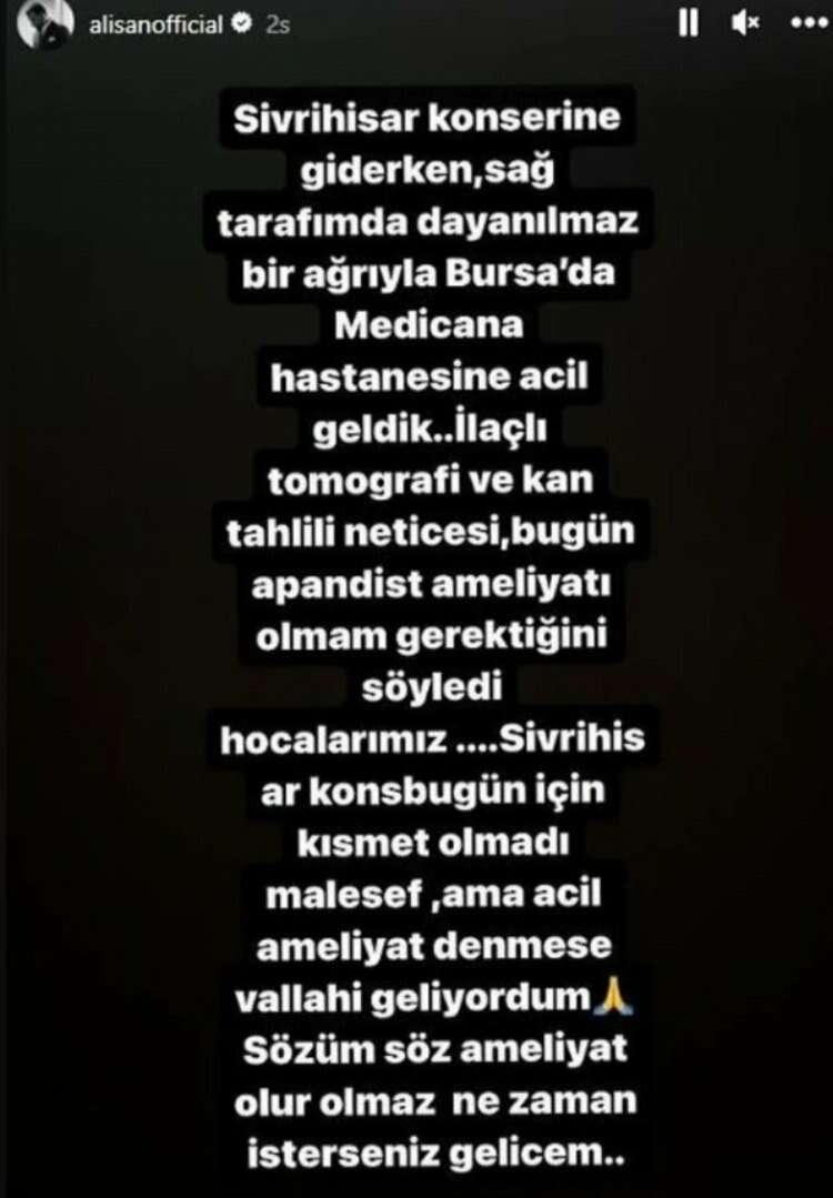 Olayı Instagram hesabından paylaşan Alişan, "Sivrihisar konserine giderken sağ tarafımda dayanılmaz bir ağrıyla Bursa'da acile geldik. İlaçlı tomografi ve kan tahlili neticesinde bugün apandisit ameliyatı olmam gerektiğini söyledi hocalarımız. Sivrihisar konseri bugün için kısmet olmadı maalesef. Acil ameliyat denmese vallahi geliyordum. Sözüm söz, ameliyat olur olmaz ne zaman isterseniz geleceğim" şeklinde açıklamada bulundu. Alişan, hayranlarına konser iptali nedeniyle özür dilerken, sağlığına kavuştuğunda tekrar sahnelere döneceğini belirtti.