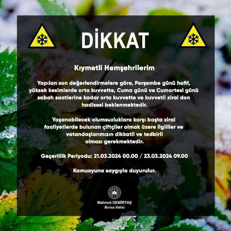 Bursa Valiliği, kuvvetli zirai don olayına karşı başta çiftçiler olmak üzere vatandaşlara uyarıda bulundu.