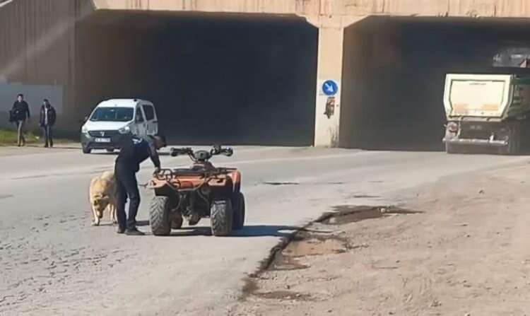 Bursa'da bir kişi, sahibi olduğu köpeği ATV'ye bağlayıp sürükledi. O anlaşılıyor ki, bir vatandaş tarafından cep telefonu kamerasıyla kaydedildi.