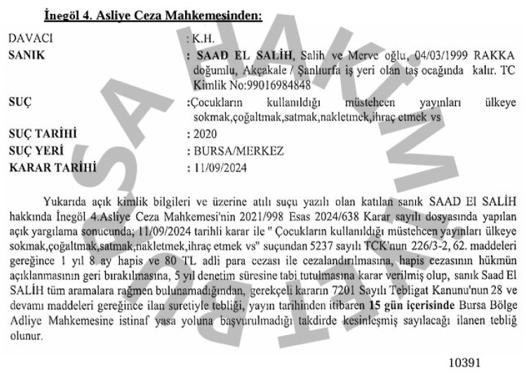 Bursa merkezde bu görüntüleri çoğaltıp satan Salih hakkında açılan dava 11 Eylül 2024 tarihinde sonuçlandı.