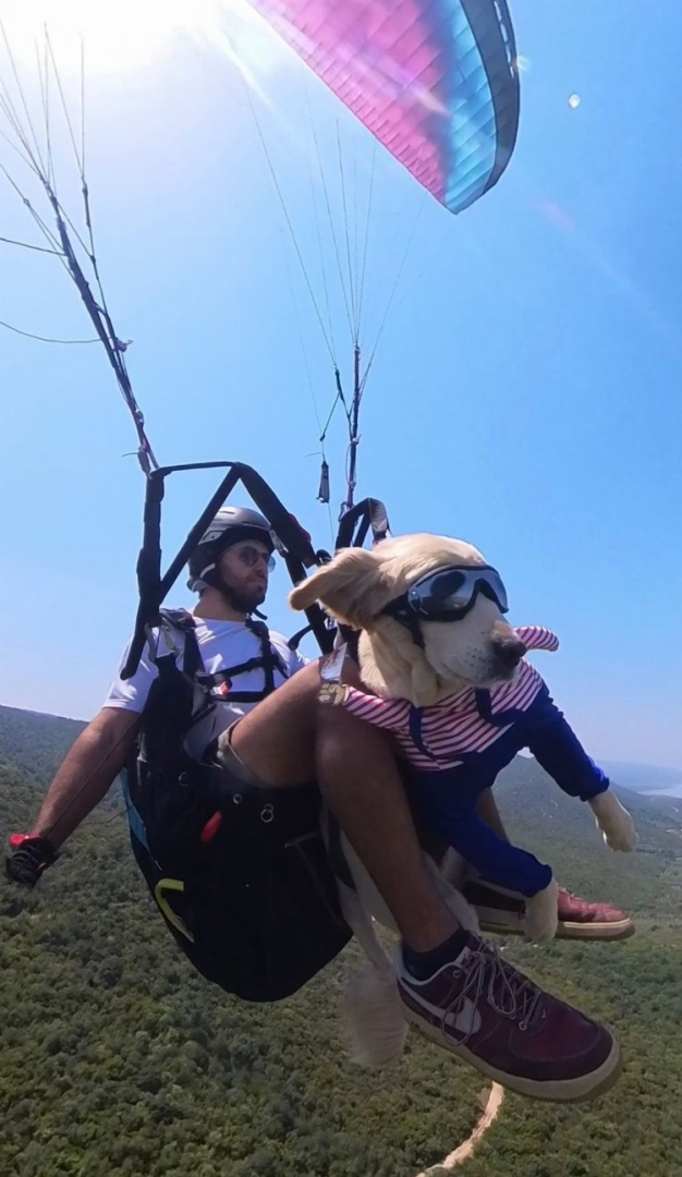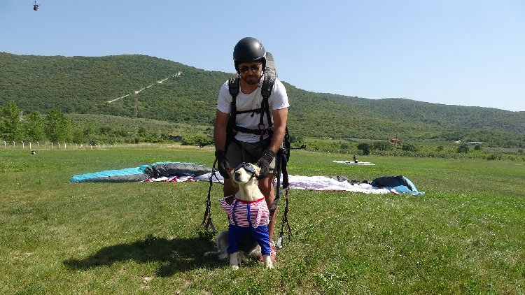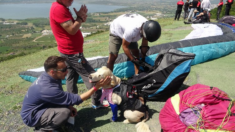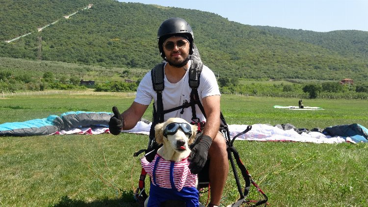 Manisa'nın Akhisar ilçesinde sokağa terk edilmiş halde bulduğu 'Golden retriever' cinsi köpeği sahiplenerek, 'Badem' ismini koyan yamaç paraşütü pilotu Yasin Oflaz (26), 4 yıldır onunla birlikte uçuyor. Bursa'da 'Üni Uçuş Günleri' etkinliğine katılan Oflaz, Badem ile birlikte uçuş yapmanın keyifli olduğunu belirterek, "Festivallere katılıp güzel anılar biriktirirken eğleniyoruz" dedi.
