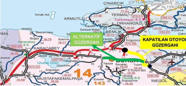 Öte yandan Karayolları Genel Müdürlüğü tarafındna yapılan açıklamada, "Bursa'nın Gürsu ilçesi Karahıdır mevkisinde meydana gelen orman yangını nedeniyle Bursa Çevre Otoyolu'nun Yıldırım kavşağı ayrım-Bursa Doğu kavşağı ile Bursa Doğu kavşağı-Turanköy kavşağı trafiğe kapatılmıştır. Ulaşım D-200 Devlet Yolu'nun Erdoğanköy-Kestel kesiminden sağlanmaktadır." bilgisi verildi.