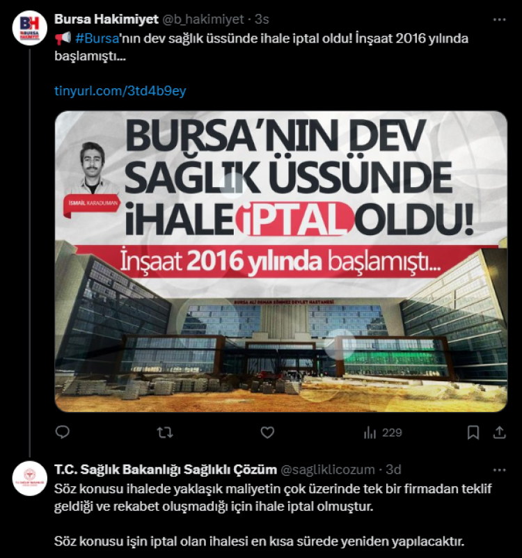 "Bursa Çekirge 750 Yataklı Ali Osman Sönmez Devlet Hastanesi İkmal İnşaatı Yapım İşi" başlıklı ihale iptal oldu.
