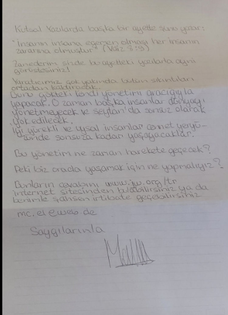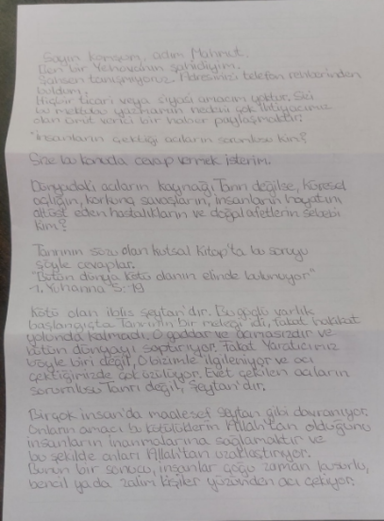 Adının Mahmut olduğunu belirten şahıs posta kutusuna bıraktığı mektupta Yehova'nın Şahitleri'nin propagandalarının yayımlandığı sitenin adresini paylaştı.
