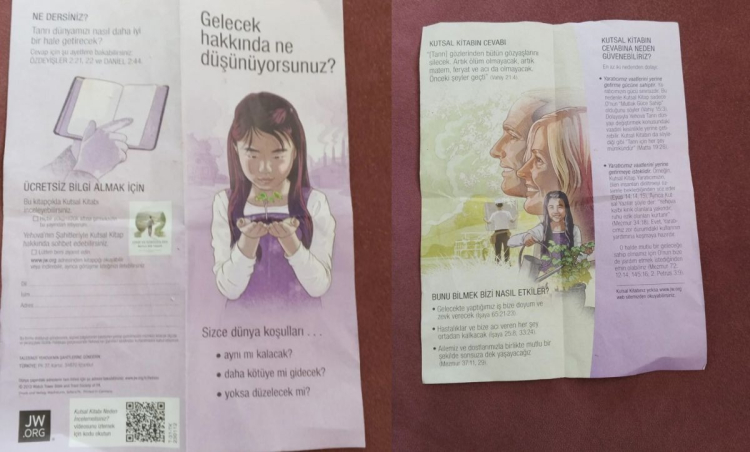 inegölonline'ın haberine göre; İnegöl ilçesine bağlı Süleymaniye mahallesinde Yehova'nın Şahitleri'nin Hristiyanlık içerikli broşürler dağıttığı öğrenildi.