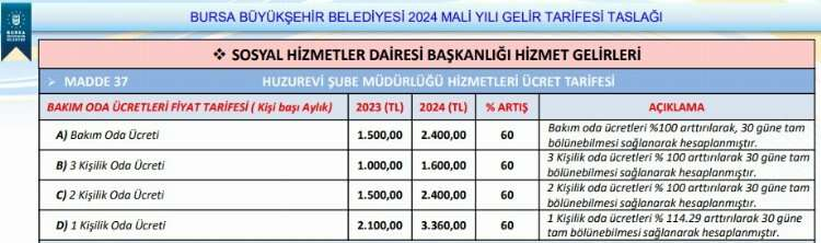 Bursa Büyükşehir Belediyesi'nin aldığı karara göre; 2023 yılında yüzde 50 oranında fiyat artışı yapılan huzurevi ücretlerine 2024 yılı itibariyle yüzde 60 oranında zam gelecek.