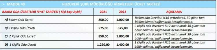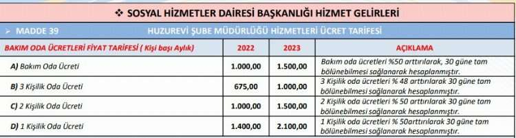 Yapılacak artış sonrası bakım oda ücreti bin 500 TL'den 2 bin 400 TL'ye, 3 kişilik oda ücreti bin TL'den bin 600 TL'ye, 2 kişilik oda ücreti bin 500 TL'den 2 bin 400 TL'ye, 1 kişilik oda ücreti 2 bin 100 TL'den 3 bin 360 TL'ye çıkacak.