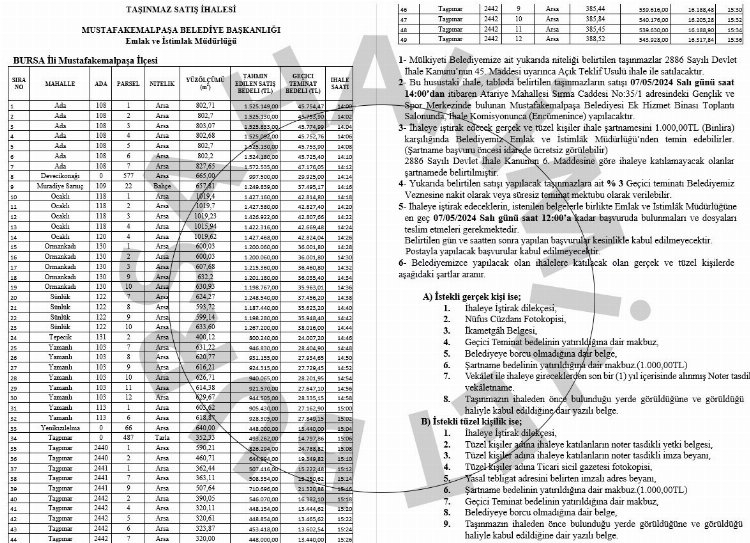 Bursa Mustafakemalpaşa Belediyesi toplamda 49 adet arsa, tarla ve bahçeyi satışa çıkardı. İşte o taşınmazlar ve fiyatları...