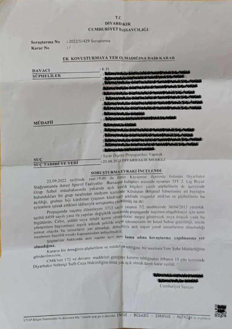 Diyarbakır Cumhuriyet Başsavcılığı, “kovuşturmaya yer yok” diyerek soruşturmada takipsizlik kararı verdi. Savcılık maçta açılan bayrağın Kürdistan Bölgesel Yönetimi’ne ait olduğunu belirterek, suçun yasal unsurlarının oluşmadığına kanaat getirdi.