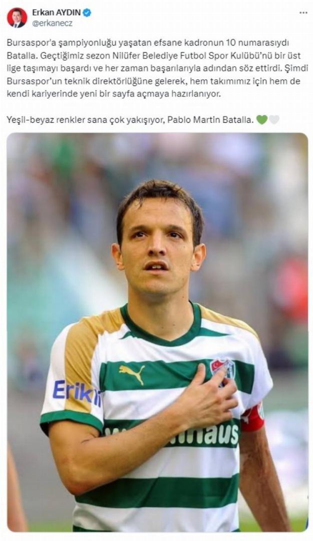 Erkan Aydın paylaşımında, “Bursaspor'a şampiyonluğu yaşatan efsane kadronun 10 numarasıydı Batalla. Geçtiğimiz sezon Nilüfer Belediye Futbol Spor Kulübü’nü bir üst lige taşımayı başardı ve her zaman başarılarıyla adından söz ettirdi. Şimdi Bursaspor’un teknik direktörlüğüne gelerek, hem takımımız için hem de kendi kariyerinde yeni bir sayfa açmaya hazırlanıyor. Yeşil-beyaz renkler sana çok yakışıyor, Pablo Martin Batalla.” ifadelerini kullandı.
