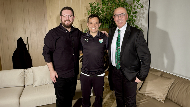 Pablo Martin Batalla’nın konuk olduğu AS TV Markaj programının ardından Arjantinli teknik adam, tercümanı Kaan Özensoy, Bursaspor Futbol Şube Sorumlusu Coykun Yavuz, Bursaspor İdari Menajeri Recep Bülbül, ACG Spor Müdürü Süha Gürsoy ve ACG Spor Editörü Barış Yalım bir araya geldi.