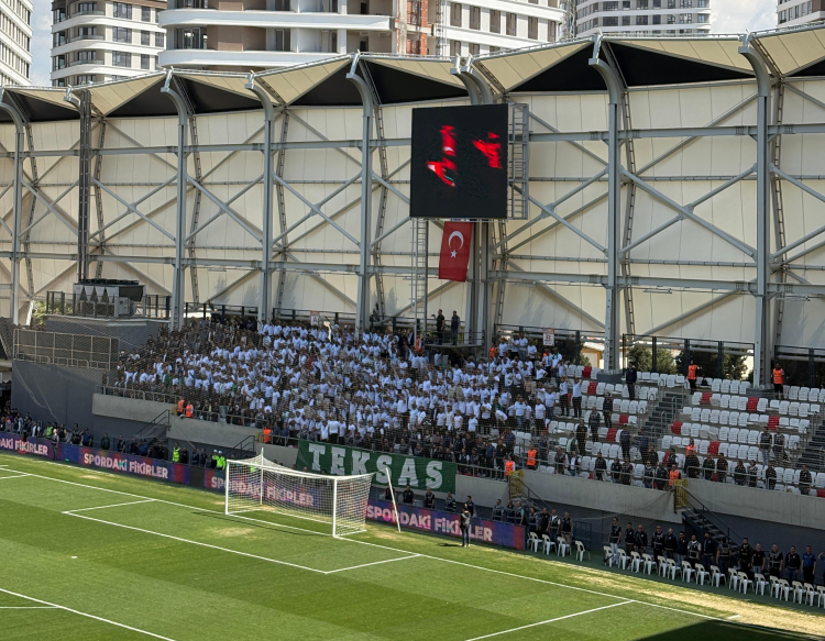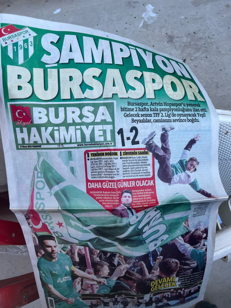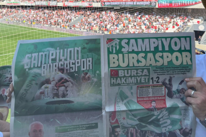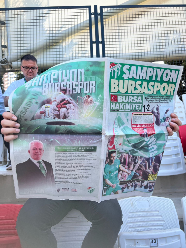 Karşıyaka tribünlerine karşı şampiyonluk haberlerinin yer aldığı Bursa Hakimiyet Gazetesi’ni açan ve okuyan Yeşil Beyaz sevdalıları, rakip taraftarları şaşkına çevirdi. İlk 6 dakika tezahürat yapmayan Bursaspor taraftarı daha sonra muhteşem bir coşkuyla ‘Şampiyon Bursa’ diye bağırdı.