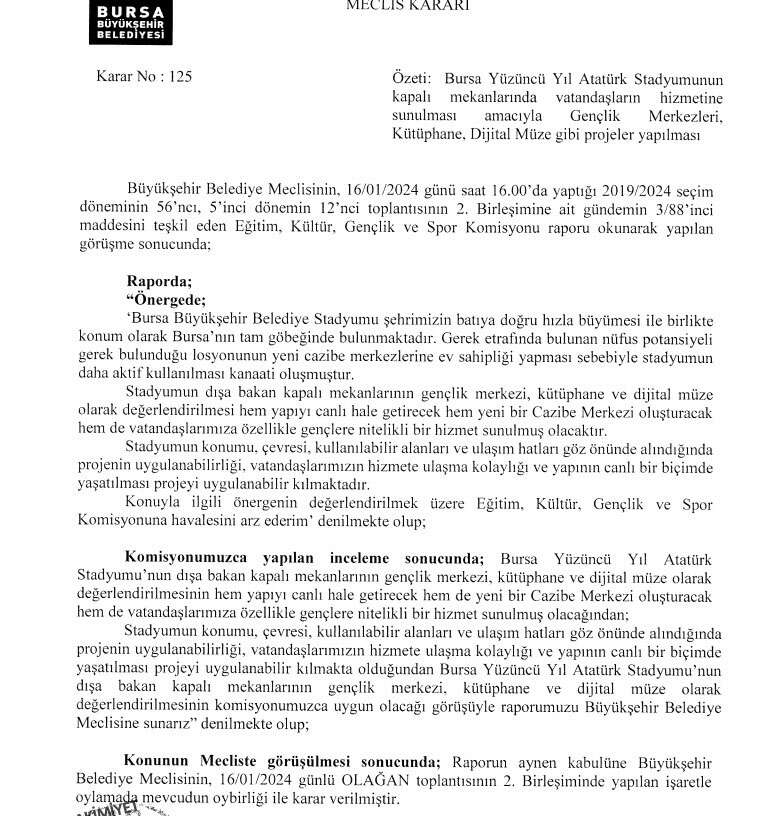 Bursa Yüzüncü Yıl Atatürk Stadytunu'nun dışa bakan kapalı mekanlarının gençlik merkezi, kütüphane ve dijital müze olarak değerlendirilmesinin hem yapı, canlı hale getirecek hem de yeni bir Cazibe Merkezi oluşturacak hem de vatandaşlarımıza özellikle gençlere nitelikli bir hizmet sunulmuş olacağından: Stadyumun konumu, çevresi, kullanılabilir alanları ve ulaşım hatlan göz önünde alındığında projenin uygulanabilirliği, vatandaşlanmızın hizmete ulaşma kolaylığı ve yapının canlı bir biçimde yaşatılması projeyi uygulanabilir kılmakla olduğundan Bursa Yüzüncü Yıl Atatürk Stadyumu'nun dışa bakan kapalı mekanlarının gençlik merkezi, kütüphane ve dijital müze olarak değerlendirilmesinin komisyonumuzca uygun olacağı görüşüyle raporumuzu Büyükşehir Belediye Meclisin sunarız."