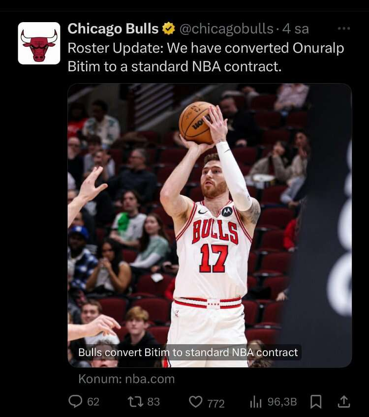 Chicago Bulls yönetimi performansıyla dikkatleri üzerine çeken 24 yaşındaki milli basketbolcunun sözleşmesini standart NBA sözleşmesine çevirdi. Yapılan yeni anlaşmaya göre Onuralp Bitim sezonun geri kalan kısmında Chicago Bulls A Takımı’yla NBA’de mücadele edecek. Bu gelişme Bursaspor İnfo Yatırım’ı da yakından ilgilendiriyor.