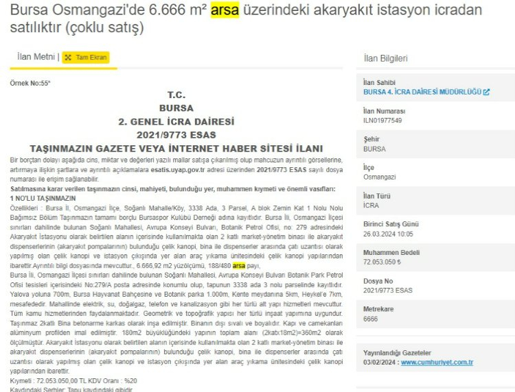 Bursa 4. İcra Dairesi Müdürlüğü tarafından yapılan duyuruda benzinlik hakkında şu ifadeler yer aldı: