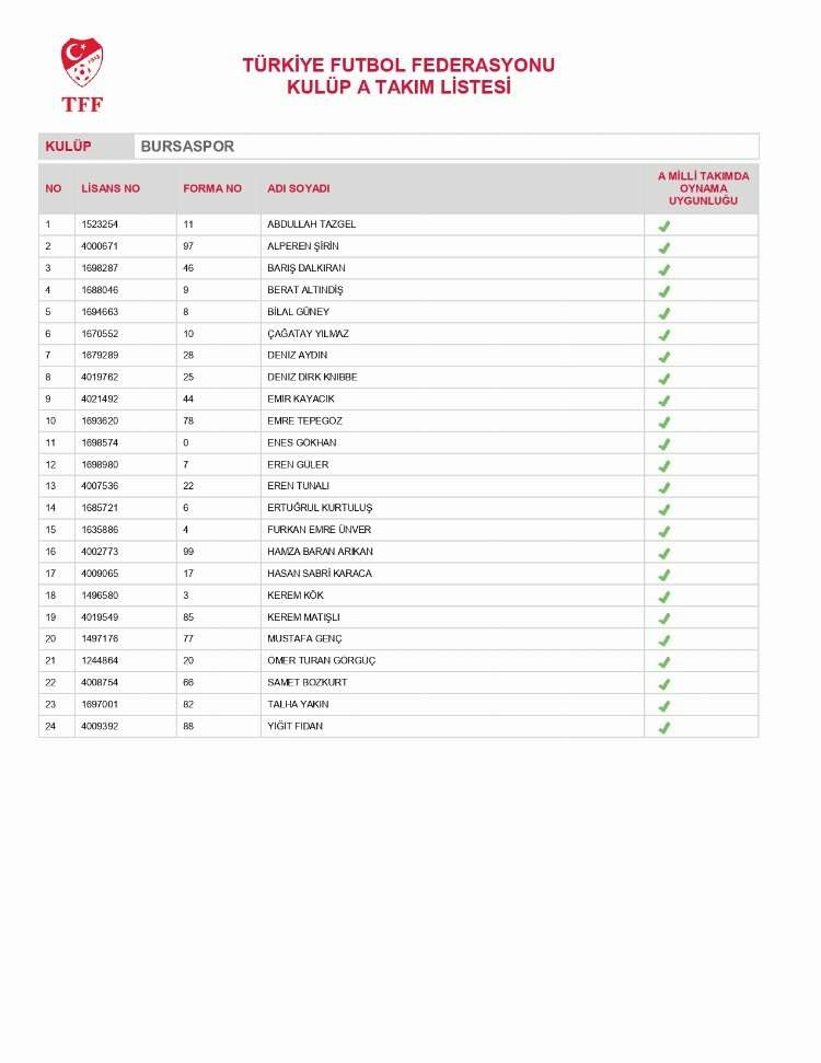 Bursaspor’un TFF’ye bildirdiği oyuncu listesi 24 kişiden oluştu.
