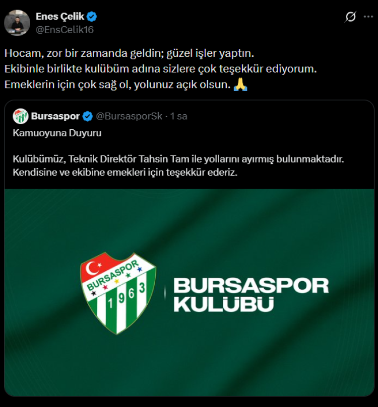Söz konusu karar sonrası sosyal medyadan açıklama yapan Bursaspor Başkanı Enes Çelik, "Hocam, zor bir zamanda geldin; güzel işler yaptın. Ekibinle birlikte kulübüm adına sizlere çok teşekkür ediyorum. Emeklerin için çok sağ ol, yolunuz açık olsun." ifadelerini kullandı.