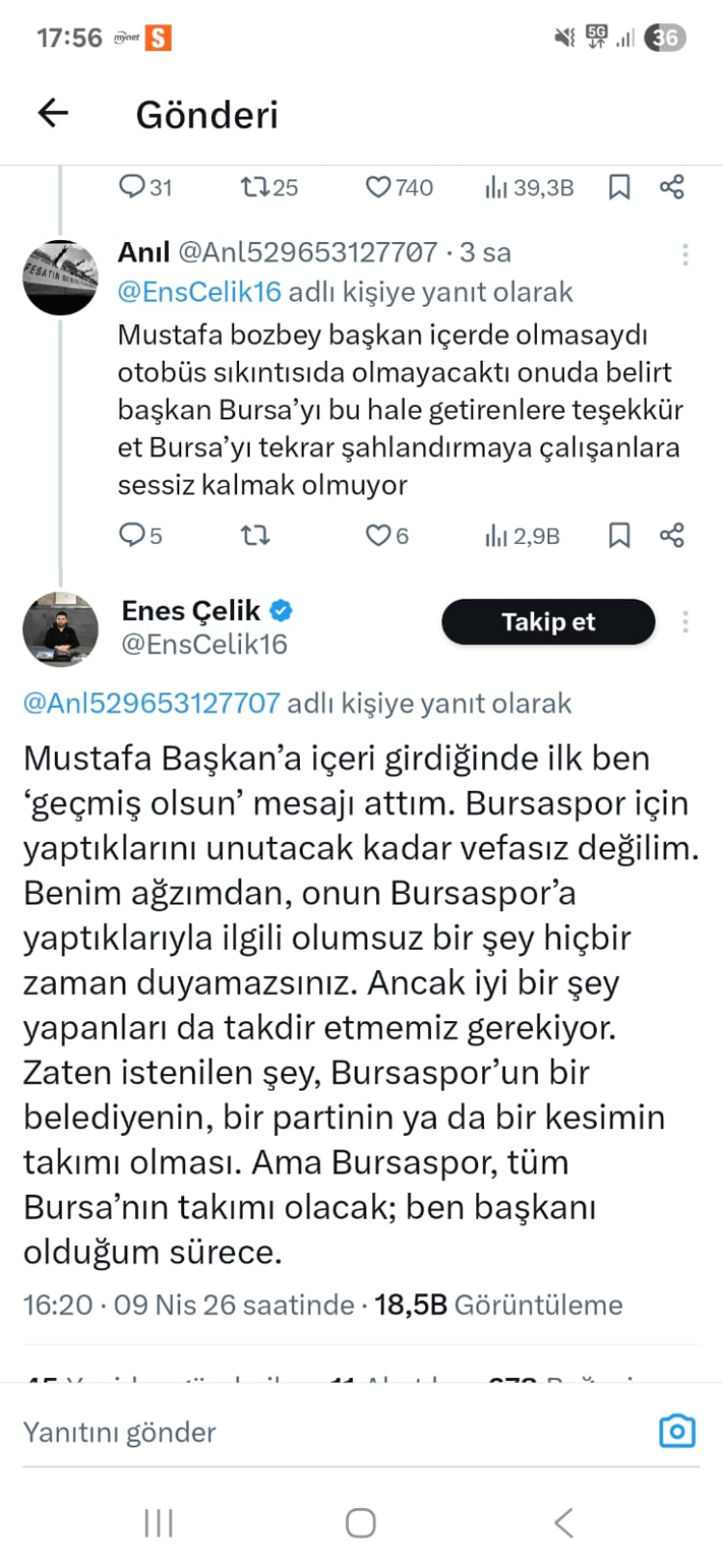 Bursaspor Başkanı Enes Çelik, bir taraftarın Mustafa Bozbey’le ilgili söylemine karşılık yaptığı yorumda, “Bursaspor için yaptıklarını unutacak kadar vefasız değilim.” dedi.