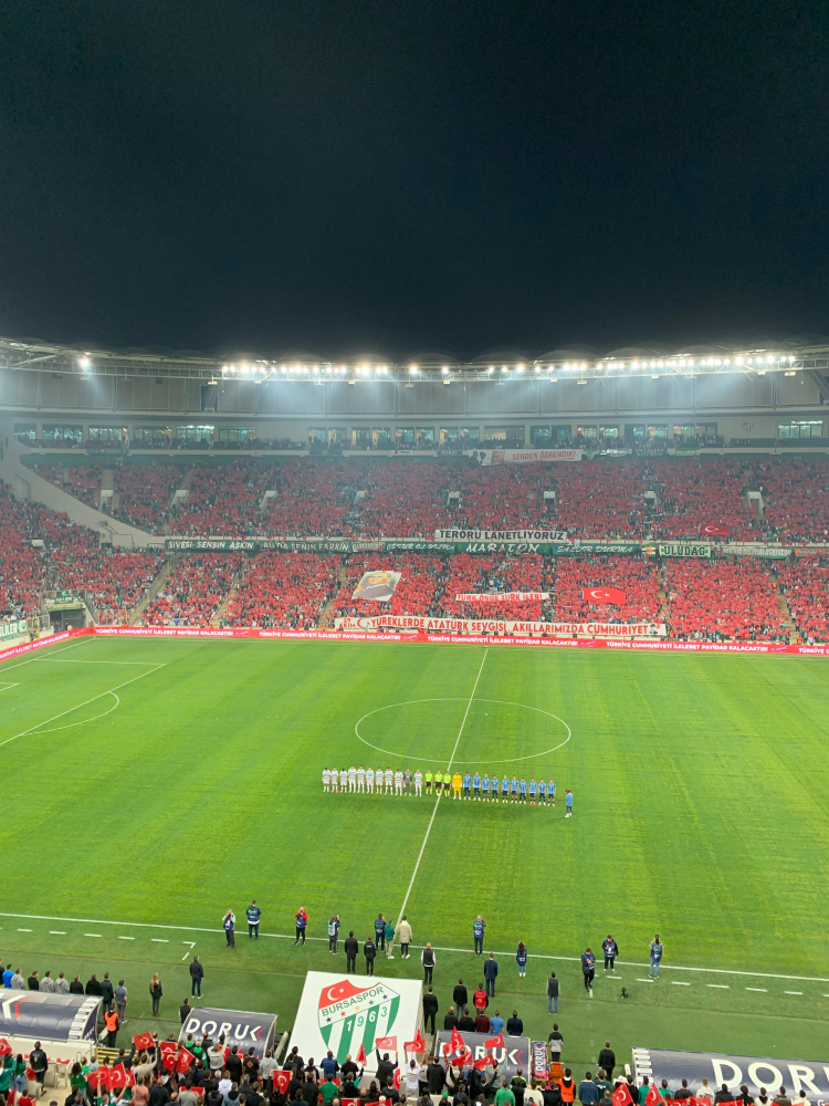 Bursaspor taraftarı, 29 Ekim Cumhuriyet Bayramı kutlamaları çerçevesinde Türkiye Cumhuriyeti’nin 101’nci kuruluş yıl dönümünü büyük bir coşkuyla kutladı.