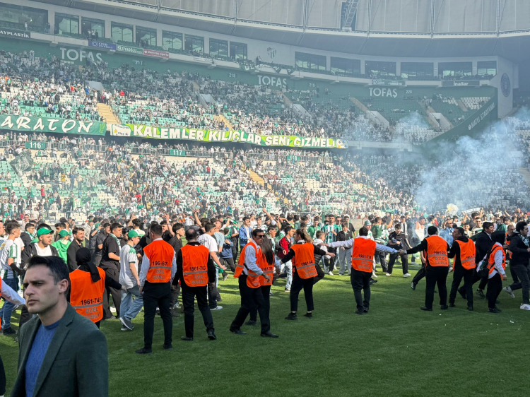 Tribünlerden bazı taraftarların sahaya inmesinin ardından stadyumdaki organizasyon geçici olarak durduruldu.