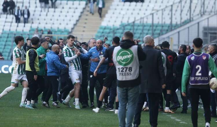 Bursaspor’la Diyarbekirspor arasında Yüzüncü Yıl Atatürk Stadı’nda oynanan ve konuk ekibin 2-0 kazandığı maçın son bölümünde iki takım oyuncuları arasında kavga çıktı.