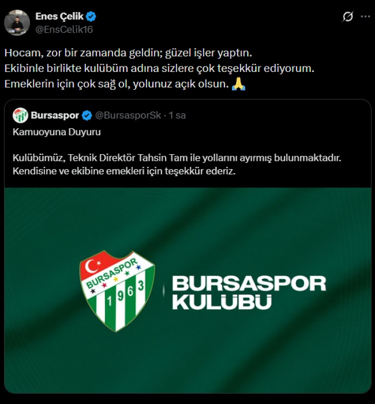 Söz konusu karar sonrası sosyal medyadan açıklama yapan Bursaspor Başkanı Enes Çelik, "Hocam, zor bir zamanda geldin; güzel işler yaptın. Ekibinle birlikte kulübüm adına sizlere çok teşekkür ediyorum. Emeklerin için çok sağ ol, yolunuz açık olsun." ifadelerini kullandı.