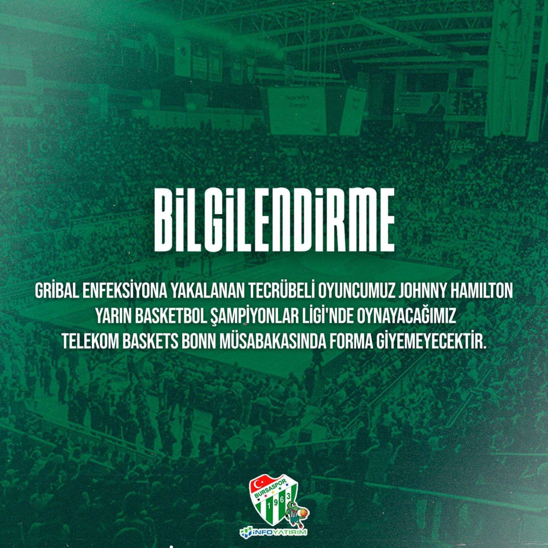 FIBA Şampiyonlar Ligi’nde yarın akşam deplasmanda Telekom Baskets Bonn ile karşılaşacak Bursaspor İnfo Yatırım’da Johnny Hamilton’un karşılaşmada forma giymeyeceği açıklandı.