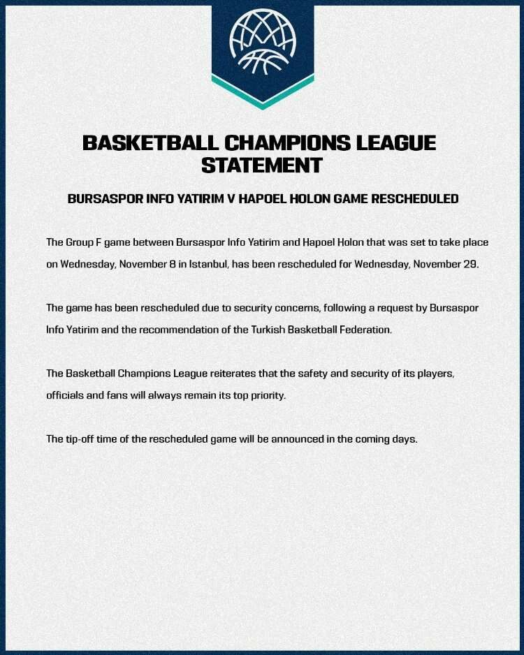Basketbol Şampiyonlar Ligi’nde Çarşamba günü oynanacak olan Bursaspor İnfo Yatırım-HapoelHolon maçı, güvenlik sebepleri nedeniyle 29 Kasım Çarşamba gününe ertelendi.
