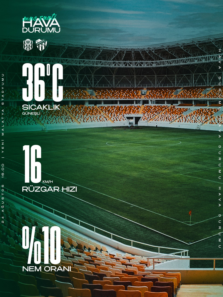 Yeni Malatya Stadyumu’nda saat 16.00’da başlayacak olan maçta hava sıcaklığı 36 derece olacak.