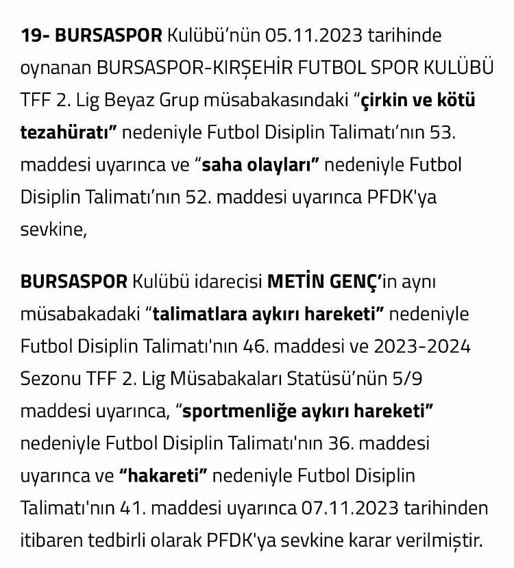 Bursaspor Kulübü, TFF 2. Lig Beyaz Grubun 12. haftasında 3-1 mağlup olduğu Kırşehir FSK maçında çirkin ve kötü tezahürat ile saha olayları, kulüp ikinci başkanı Metin Genç de talimatlara aykırı hareket, sportmenliğe aykırı hareket ve hakareti sebebiyle TFF Hukuk Müşavirliği tarafından Profesyonel Futbol Disiplin Kurulu’na (PFDK) sevk edildi.