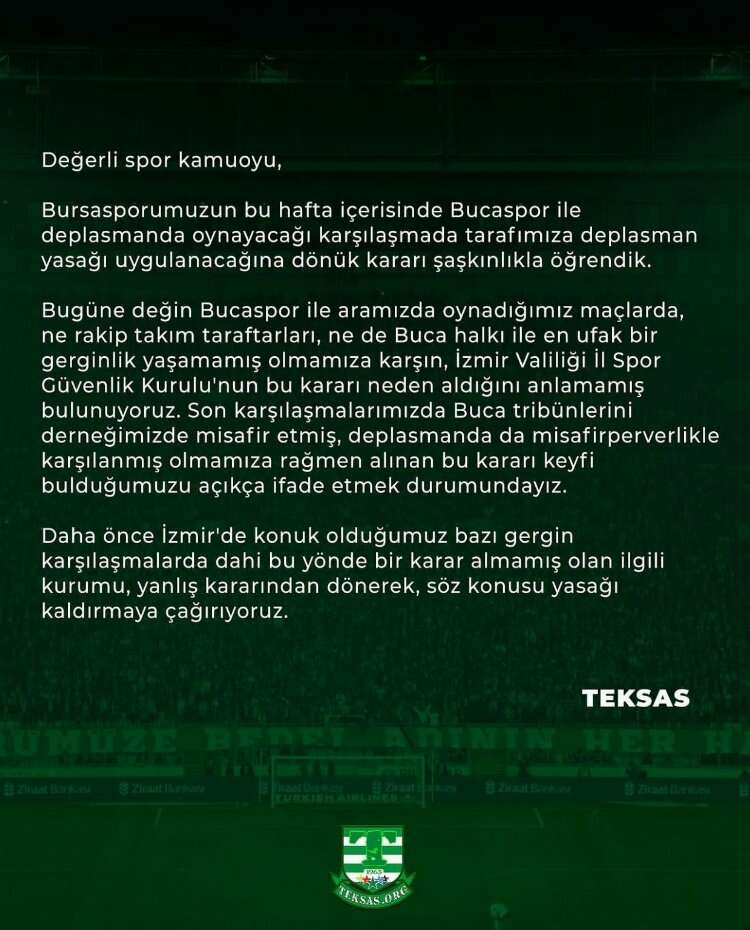 Bursaspor'un TFF 2. Lig Beyaz Grup’ta Bucaspor 1928 ile İzmir’de oynayacağı maçta İzmir İl Spor Güvenlik Kurulu tarafından Yeşil Beyazlı taraftarların Yeni Buca Stadı’na giriş yapamayacağını açıklanmıştı. Alınan karara Bursaspor taraftar grubu Teksas'tan tepki gecikmedi.