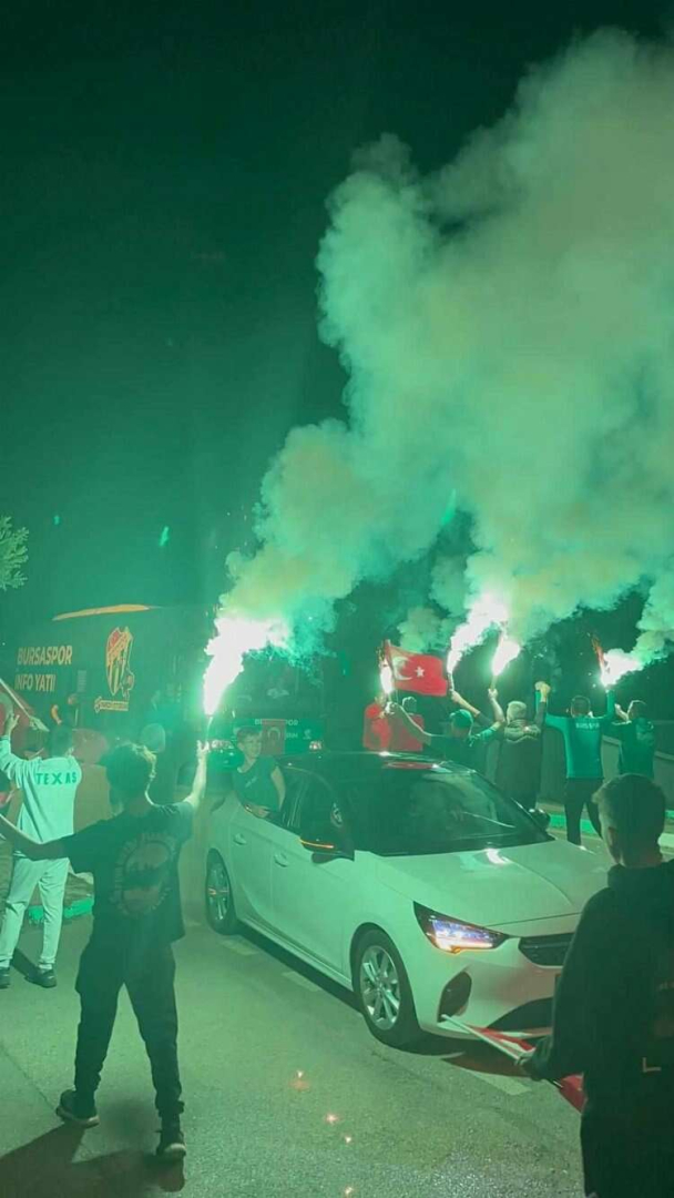 Kara yoluyla Bursa’ya dönen kafileyi meşaleler ve tezahüratlarla karşılayan Bursaspor taraftarı, oyuncularla hatıra fotoğrafı çektirmeyi de ihmal etmedi.