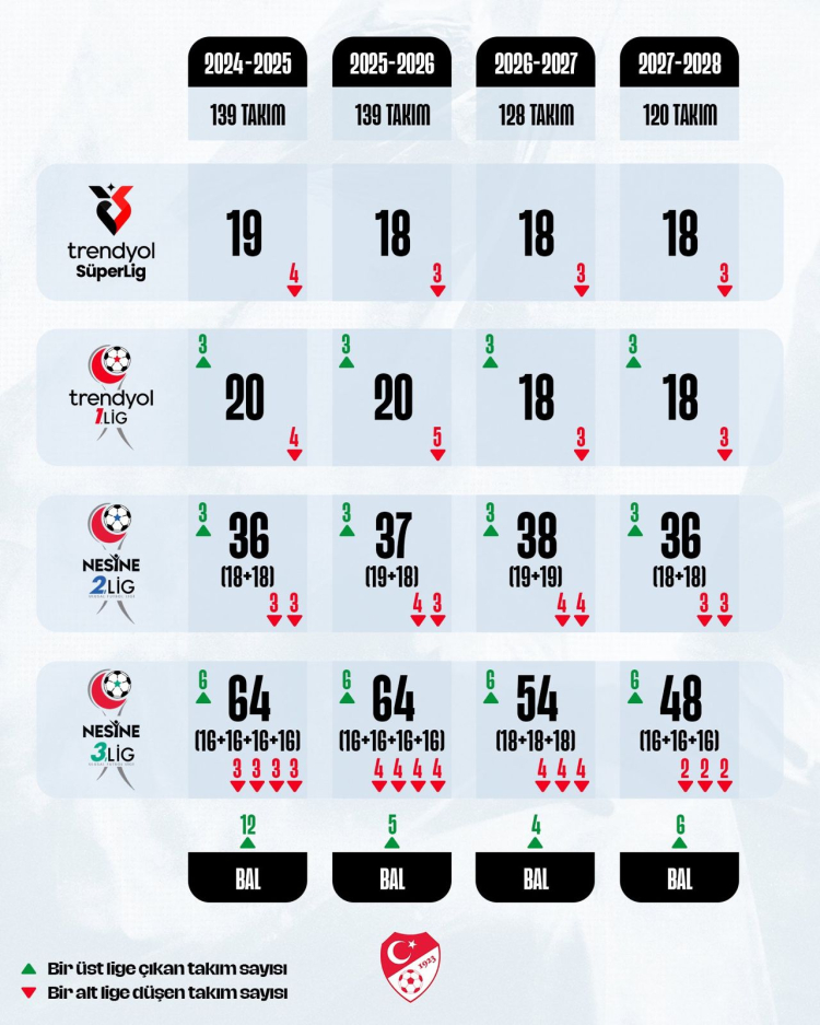 Kulüp gelirlerinin artırılması ve daha güçlü bir rekabet ortamı oluşturulması amacıyla, 2025-2026 sezonunda 139 takımın mücadele edeceği profesyonel liglerdeki takım sayısının kademeli olarak azaltılmasına gidilecektir ve hâlihazırda 139 olan profesyonel takım sayısı, aşağıdaki görselde sezonlara göre belirtilen düşme ve çıkma sayılarına göre 120'ye düşürülecektir.”